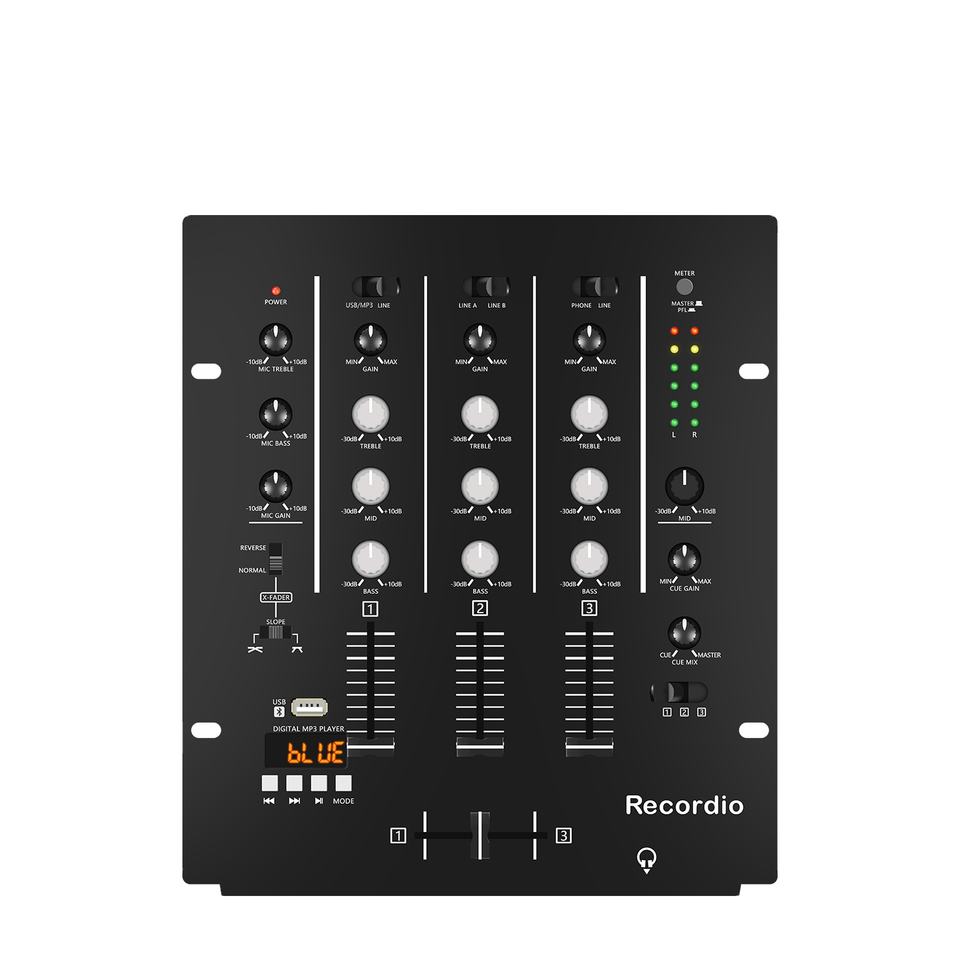 Console de mixage DJ 3 canaux au format compact, conçue pour les bars, les fêtes, les concerts et l’usage domestique. Elle associe un boîtier métallique robuste, des options de connectivité modernes (Bluetooth, USB) et une alimentation universelle. Une solution simple et efficace pour le contrôle musical.