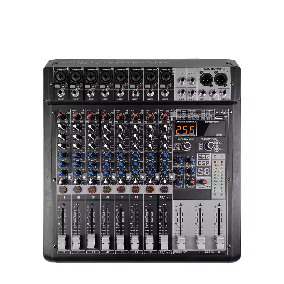 La table de mixage DJ GAX S8 Pro est une console audio professionnelle à 8 canaux conçue pour les DJ, animateurs, événements live, studios de musique et installations de sonorisation.